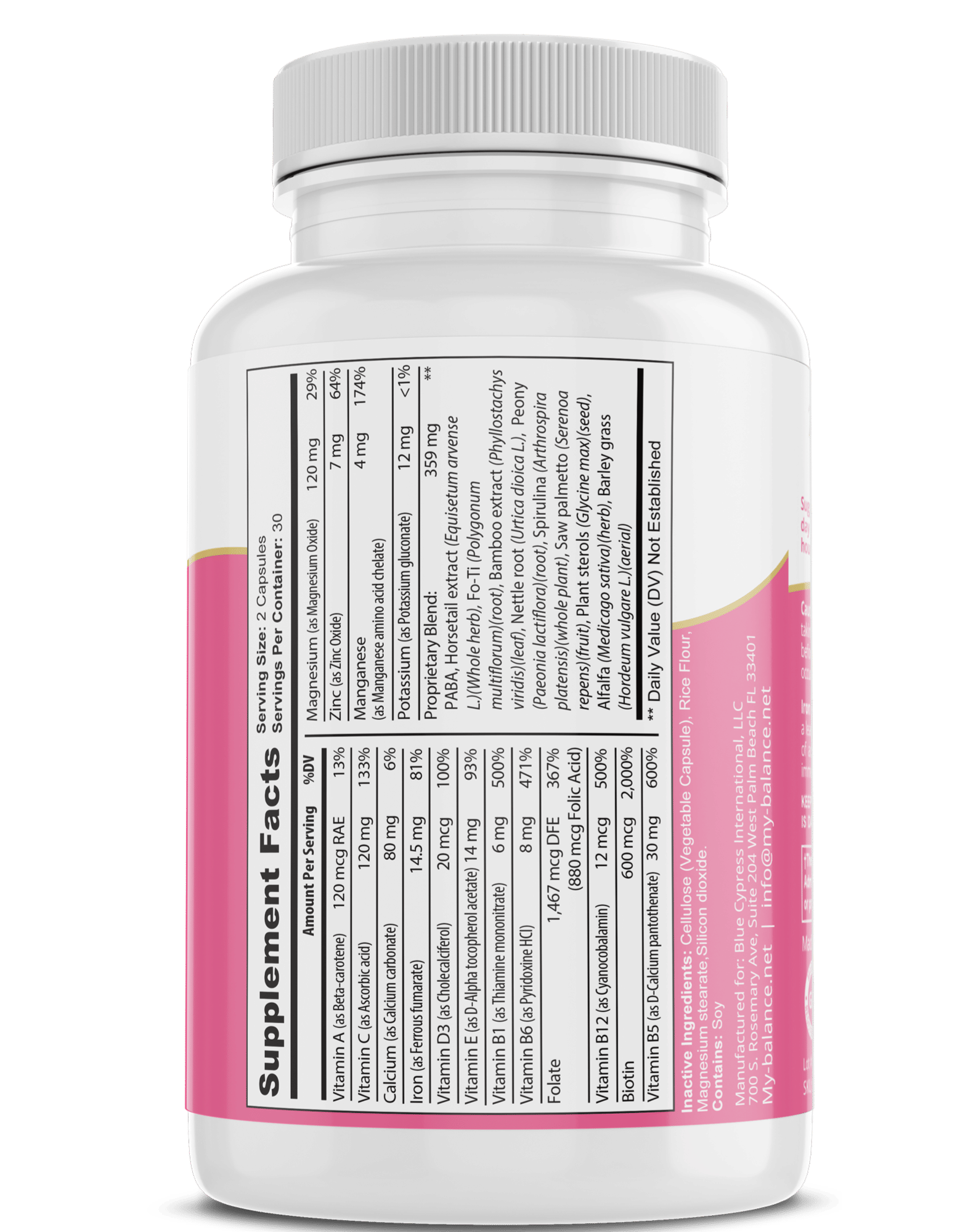 My Balance Women's Multivitamins offer a complete solution for supporting hair, skin, and nail health while providing essential daily nutrients. Embrace your natural beauty and nourish yourself from the inside out with this carefully crafted blend of vitamins and minerals.
