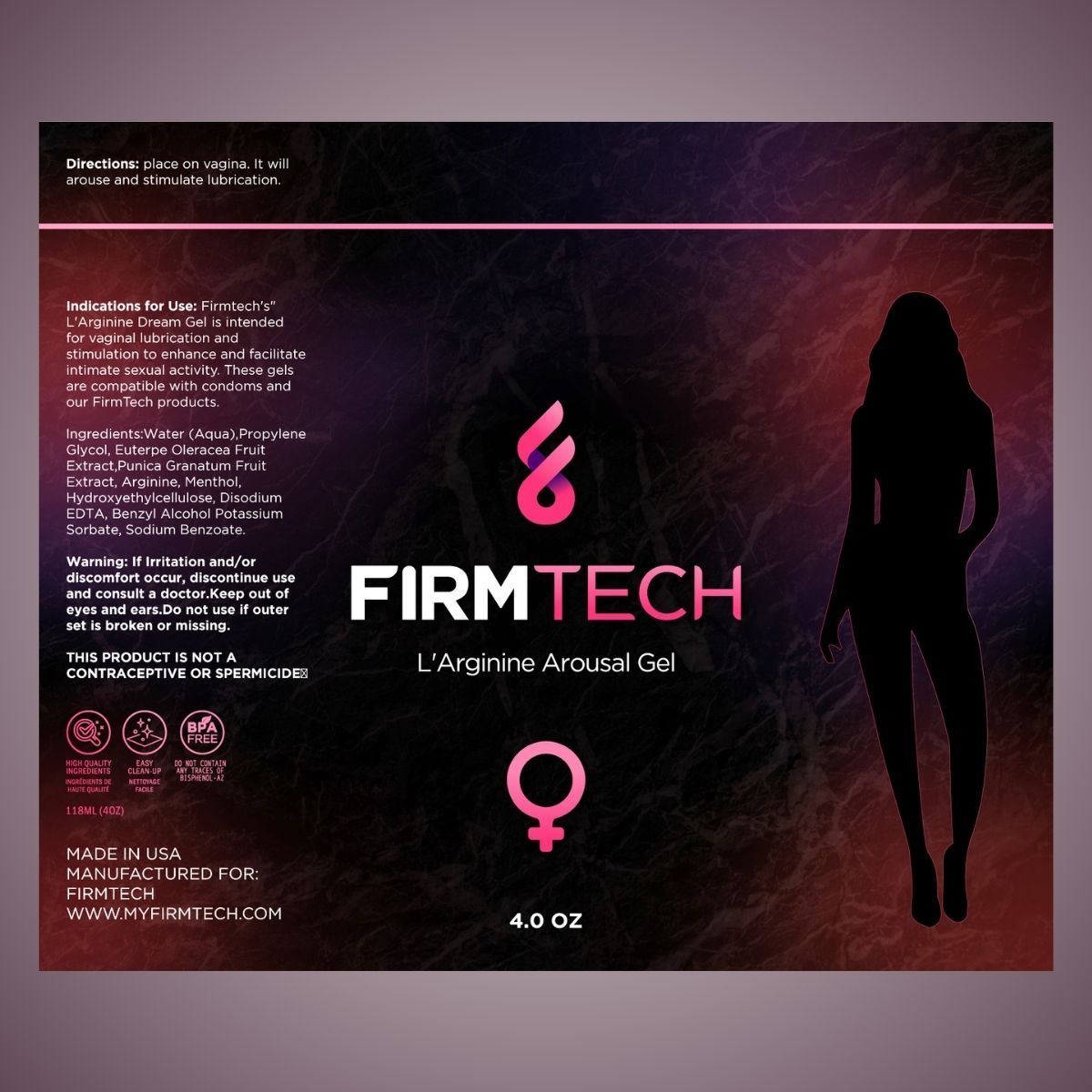 FirmTech's L'Arginine Arousal Gel works on mucosal tissue – not on the epidermis of the penis. Applied topically to the labia and clitoris, it is very quickly absorbed, and the impact is almost immediate. The labia and clitoris engorge with blood which leads to increased arousal and lubrication.